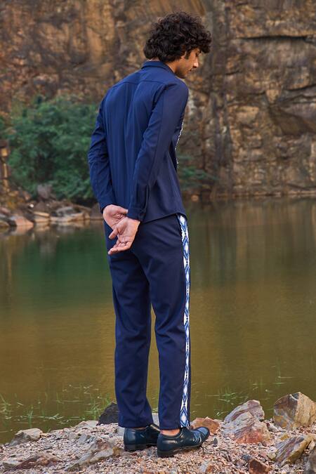 Navy blue button down shirt with jacquard geometric pattern bib panel, collar & full cuff sleeves. Paired with straight pants with jacquard side stripe details & side pockets.