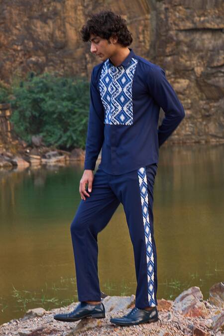 Navy blue straight tuxedo pants with jacquard side stripe panels, side & back pockets.