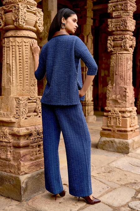 Blue knit top featuring a basketweave textured collar and three-fourth sleeves. Paired with matching wide-leg pants for a cohesive look.