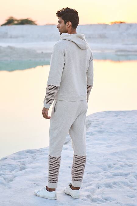 White hoodie featuring a high neck and full sleeves with cotton mesh cuff details