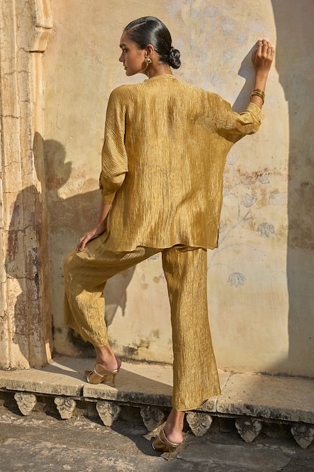 Gold top featuring a notched neckline and mirror embroidered placket. Comes with a matching slip.