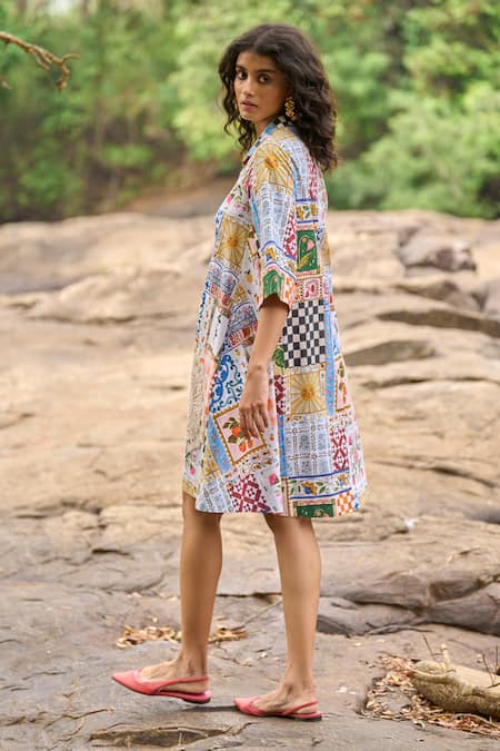 Multi Color Polyester Collared Crochet Print Shirt Dress