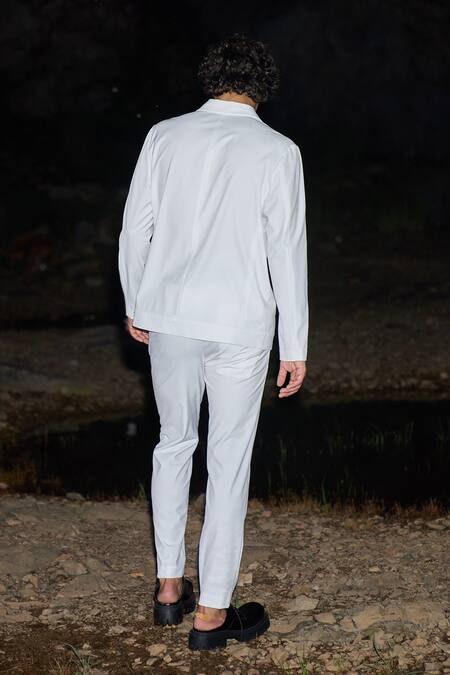 White button down jacket with notched collar, patch pockets & full sleeves. Paired with straight pants with side & back pockets.