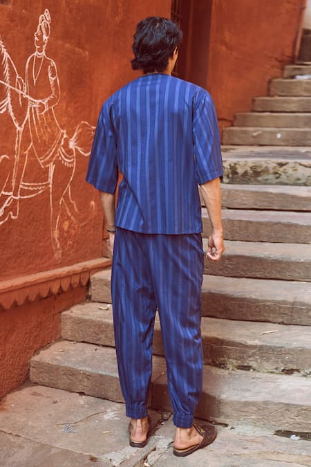 Blue pant featuring pinstriped detailing and an elasticated waistline