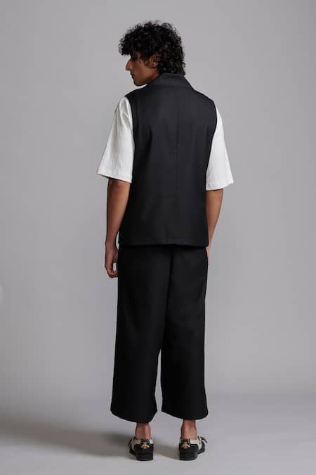 Black wide-legged pant featuring hand-sewn pleats at the waist and a flared hem