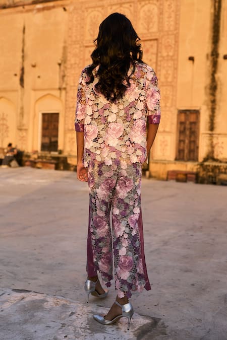 Multicolor flared pant featuring cutwork floral lace in tones of lavender and fuchsia with grey accents and a scalloped hem