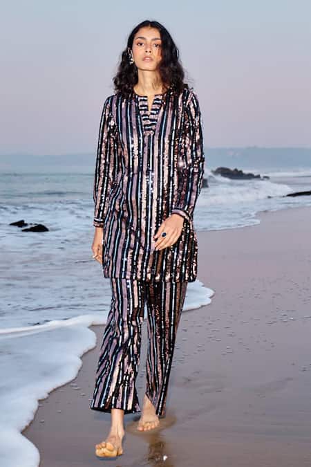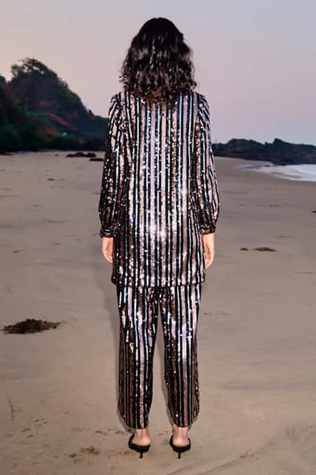 Black straight pant featuring sequin embroidery in a stripe pattern
