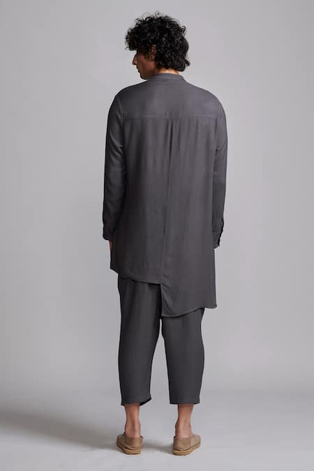 Grey cropped pant in textured organic viscose featuring hand-sewn pleats in the front