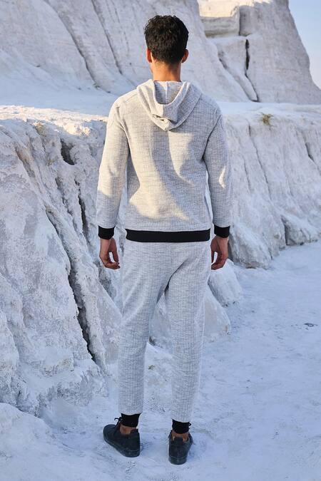 Grey jogger pant in a textured base featuring contrast rib detail at the waist and cuffs