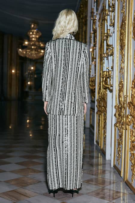 A black and white monochrome blazer jacket is crafted from 100% polyester, featuring sequin embroidery in a stripe pattern, a notch collar, a single hammered gold button closure, and full sleeves with clean cuffs. It is paired with a coordinating skirt.