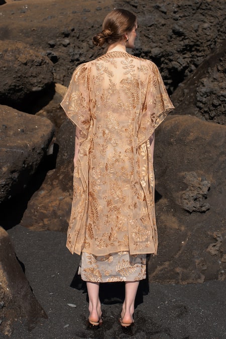 Copper cape featuring all-over tropical motifs with badla stitch embroidery. Paired with a silver grey embroidered skirt with a side high slit and bandeau top.