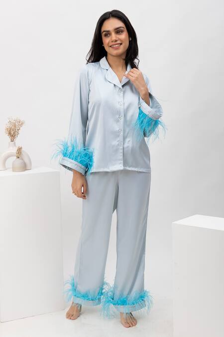 Blue Silk, Satin Feathers Collared Detailed Shirt And Pant Set
