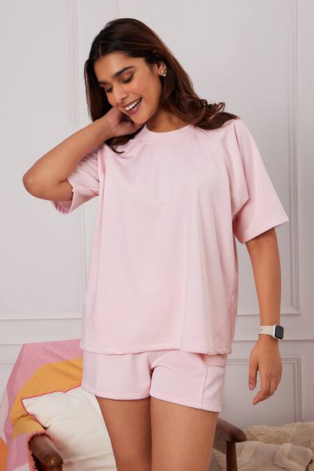 Pink Scuba Round Oversized Neck T-shirt And Shorts Set