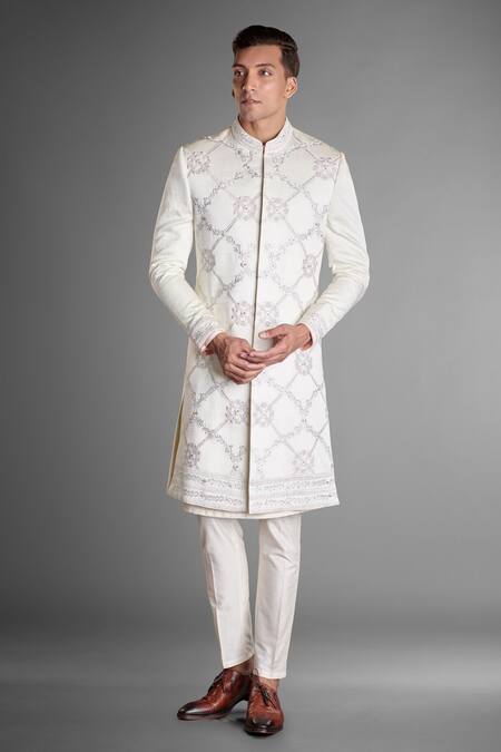 Cream sherwani crafted in silk linen featuring floral and geometric embroidery. Paired with a cotton silk kurta and trouser.