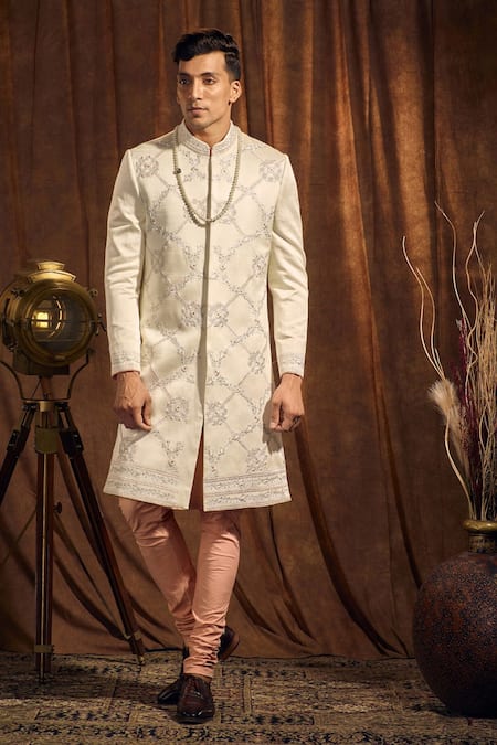 Cream sherwani crafted in silk linen featuring floral and geometric embroidery
