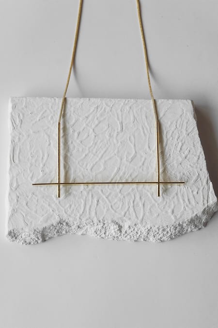 Gold-tone long chain necklace featuring a bar detail in geometric design