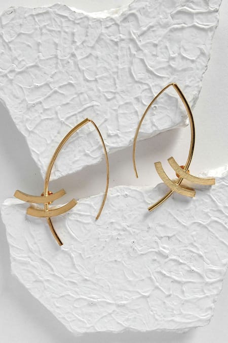 Gold tone abstract crescent ear cuffs featuring a contemporary design. Dimensions measure 8 cm in height and 5 cm in width.