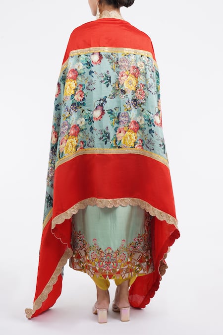 Pale blue kurta featuring intricate embroidery and three-quarter sleeves. Paired with a contrasting yellow salwar and a floral printed red color blocked dupatta.