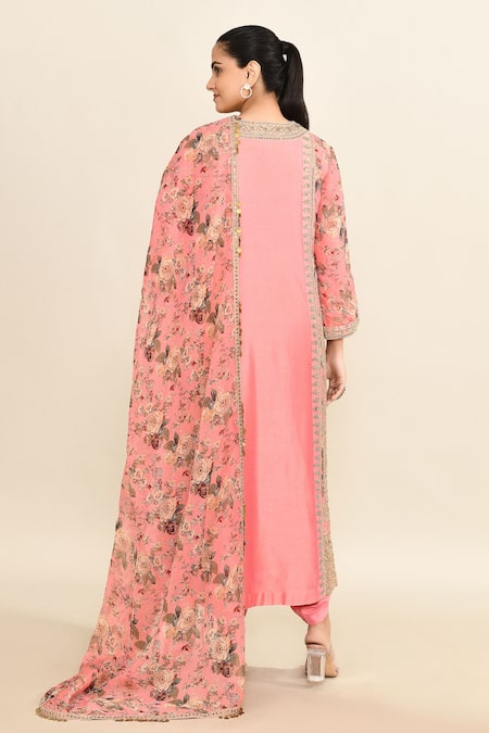 Pink kurta with floral printed panels featuring sequin, coin, and gota embroidery. Paired with a draped dhoti pant and floral printed dupatta.
