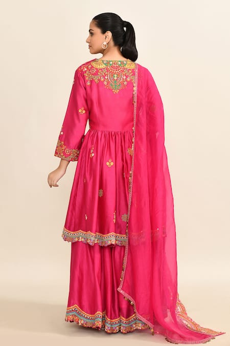 Magenta peplum kurta featuring floral, thread embroidery with sequin & coin detailing. Paired with an embroidered scallop hem sharara and an embroidered dupatta.