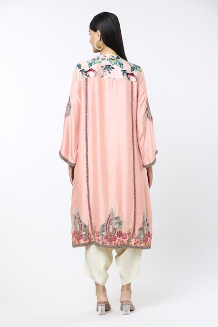 Pink straight kurta featuring multi-colored floral and paisley embroidery. Paired with a solid salwar for a complete look.
