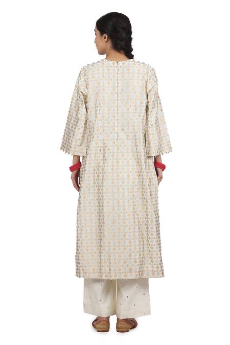 Ivory straight kurta with dual gold and silver signature faridkot prints and intricate hand work on the neck. Comes with loose cropped palazzo and organza dupatta.