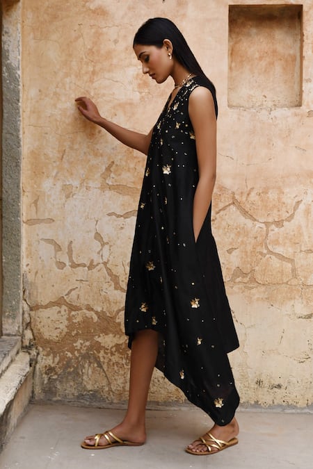 Black asymmetric dress featuring zari and phool guchha embroidery