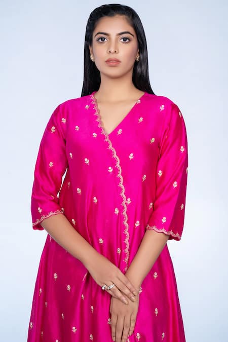 Pink anghrakha wrap dress with floral motifs all over. Comes with straight pants.