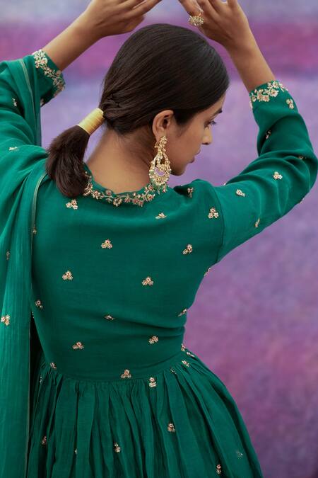 Green floral embroidered angrakha style anarkali. Paired with embroidered sharara and chanderi dupatta.