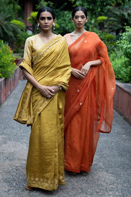 Aari and zardozi work, Banarasi striped blouse, Note:, The orange saree worn by the other model is not for sale
