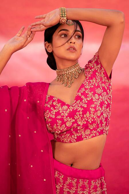 Pink Silk, Organza Bead Work, Thread Work, Floral Jaal Embroidered Lehenga Set