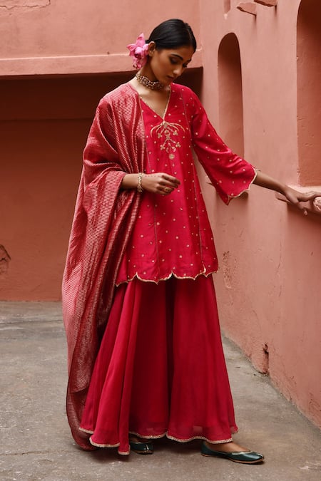 Red Chanderi, Tissue Embroidery V-neck Panelled Short Kurta Set
