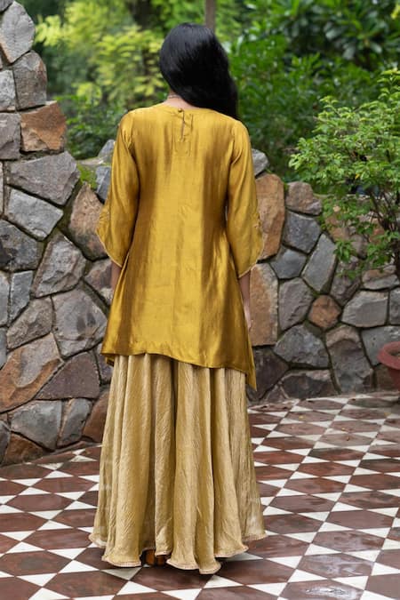 Molten gold yellow silk kurta with embroidered yoke. Paired with sharara & dupatta with tissue silk details.