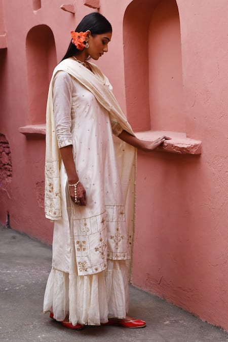 Ivory Silk, Chanderi Zari, Embroidery V-neck Kurta Sharara Set