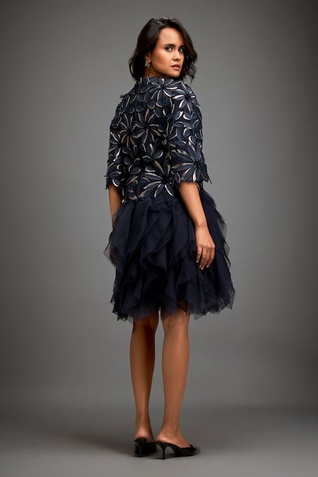 Navy blue three fourth sleeves 3D cutwork bloom applique detailing & a ruffled bottom detailing.