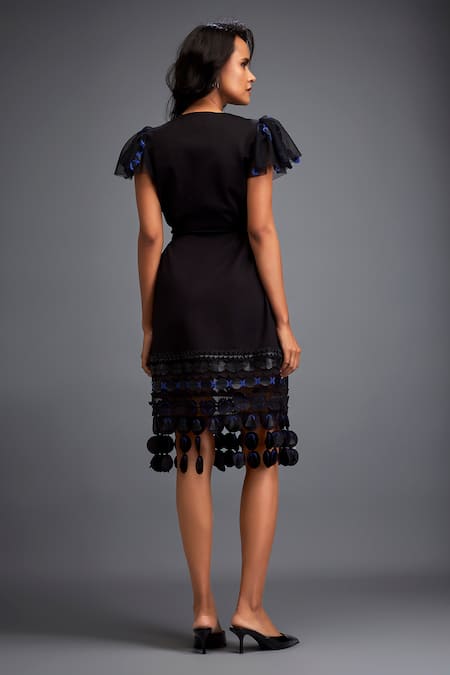 Black Pashmina Applique V-neck Geometric Embroidered Dress
