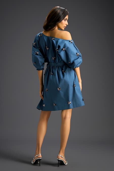 Blue dress featuring off-shoulder design with puff sleeves and an elasticated waist