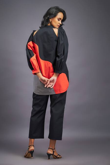 Black Cotton Mandarin Collar Colour Block Shirt With Pant