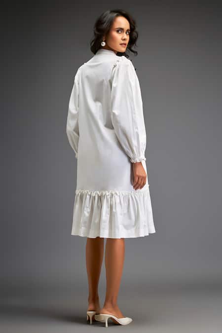 White Cotton Embroidery Mandarin Collar Contrast Flower Applique Dress