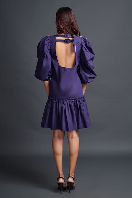 Purple dress featuring balloon sleeves and geometric applique embroidery