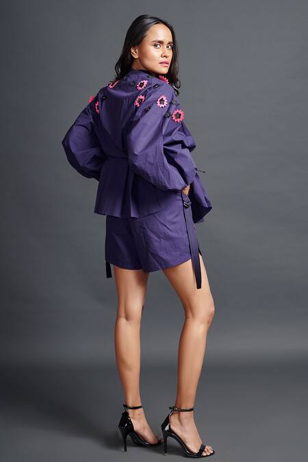 Purple pleated oversize shirt featuring cutwork confetti applique embroidery. Paired with matching shorts and includes side pockets and a front concealed button placket.