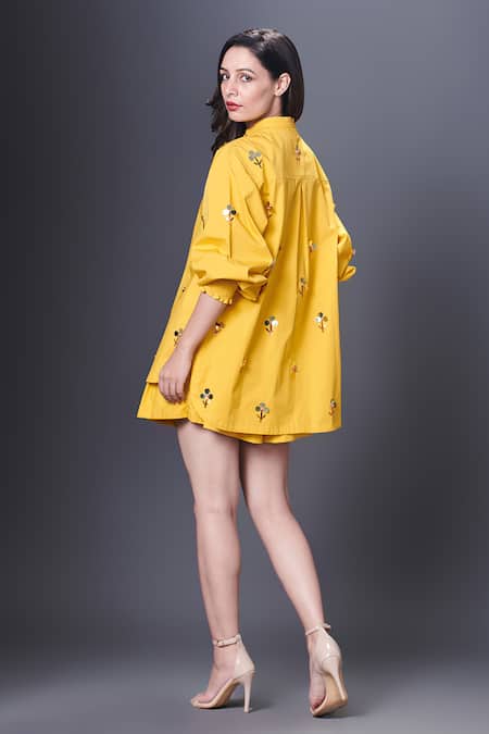 Yellow shirt featuring hand embroidered sequins flowers and a band collar