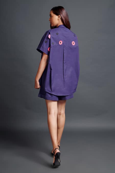 Purple cotton oversized shirt featuring cutwork geometric applique embroidery and a mandarin collared neckline. Paired with matching shorts that include side pockets and a box pleated back.