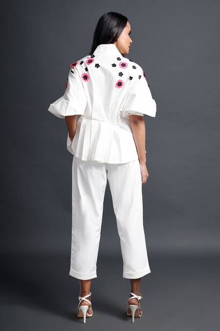 White Cotton Fabric Flowers, Applique Mandarin Collar Shirt And Pant Set