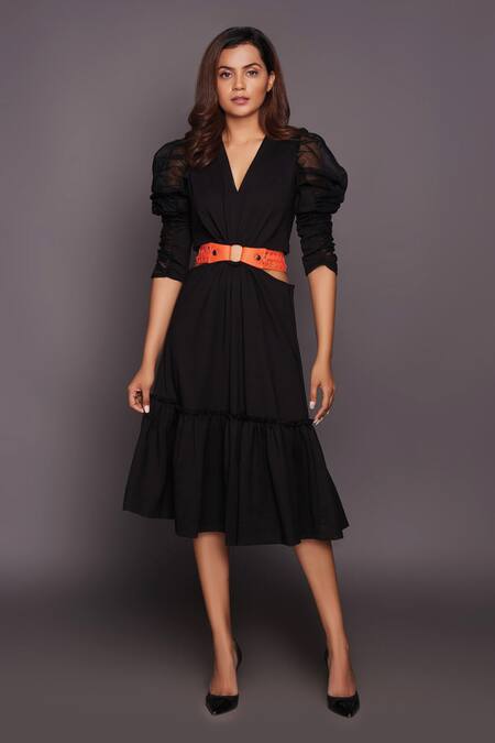 Black midi dress featuring cowl sleeves and a V neck. Designed with a frilled hem and includes a contrast perforated belt.