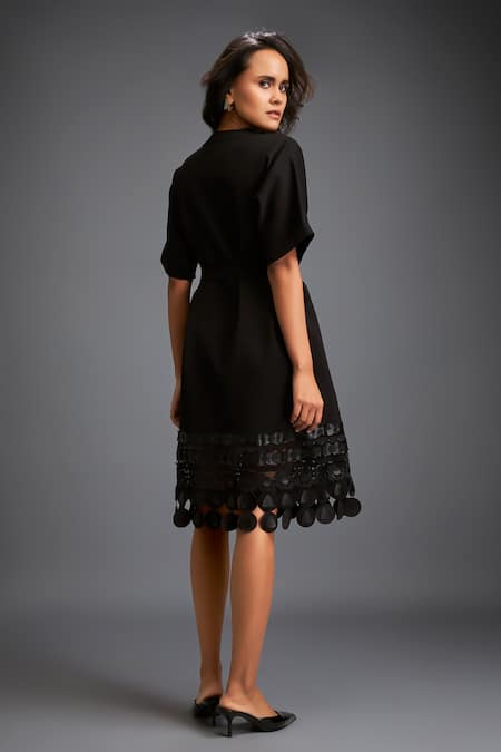 Black dress featuring round neckline and three quarter sleeves with cut-out motifs