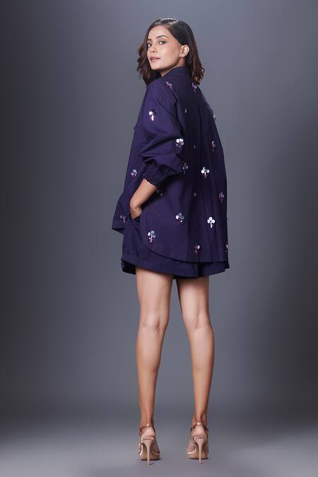Navy blue cotton shirt featuring hand embroidered sequins flowers and a band collar