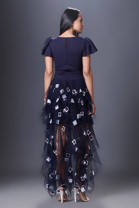 Cut-out detailing on the waist, Ruffled hem with layered design, Floral and geometric applique embroidery