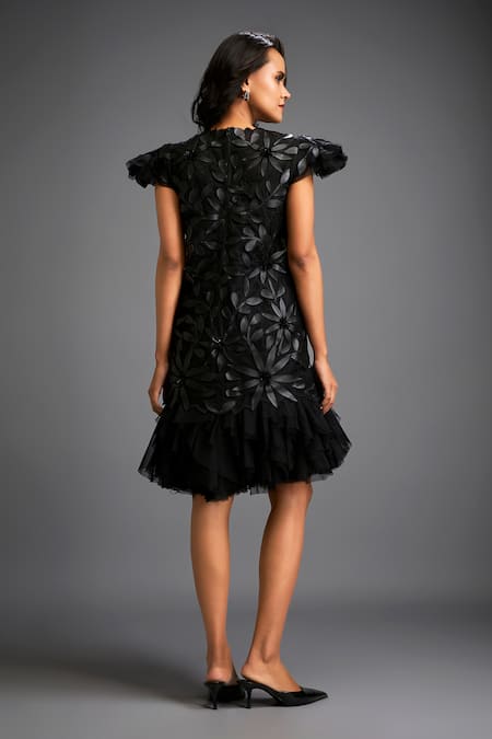 Buy_Deepika Arora_Black Net Ruffles Crew Neck Floral Applique Dress