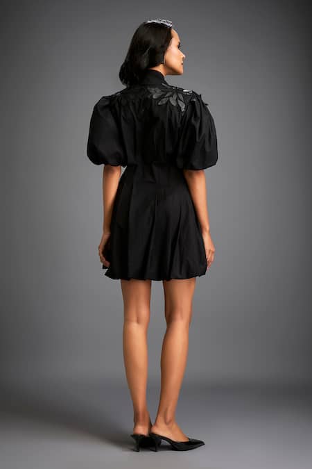 Black Cotton Fabric Flowers Collared Floral Applique Mini Dress